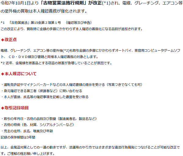 | ●農機具・トラクター・耕運機●チェーンソー(エンジン)●草刈り機など●バイク・バッテリー (バイク、車用)●水中ポンプ・発電機・溶接機●各種エンジン●鉄製のロッカー・鉄パイプ類●各工場機械・電動機械●鉄・鉄スクラップ・自動販売機 |